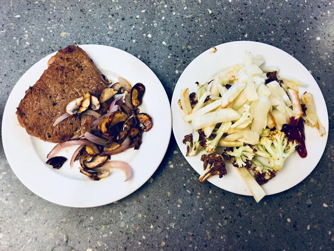 牛排、洋葱、口蘑、烤菜花和薯条