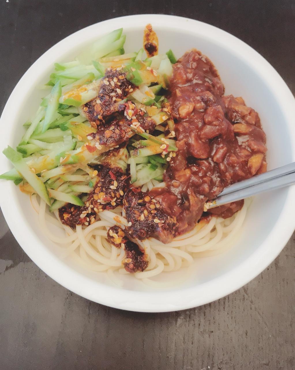 鸡蛋炸酱面!为了一口吃的,我可是拼了…华人超市也没有干黄酱,就只有用黄豆酱和甜面酱对付了! #晚餐•2018年7月31日...