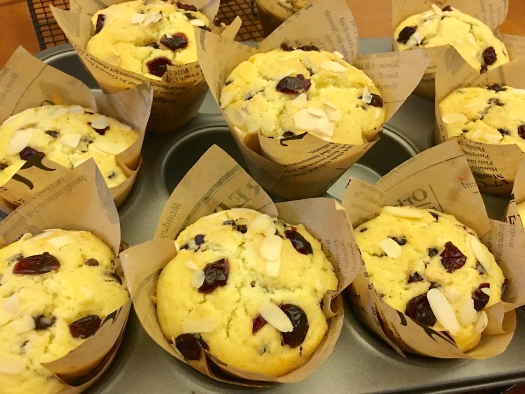 做几个蔓越莓麦芬蛋糕明天做早点😋加了点巧克力豆口感不错。