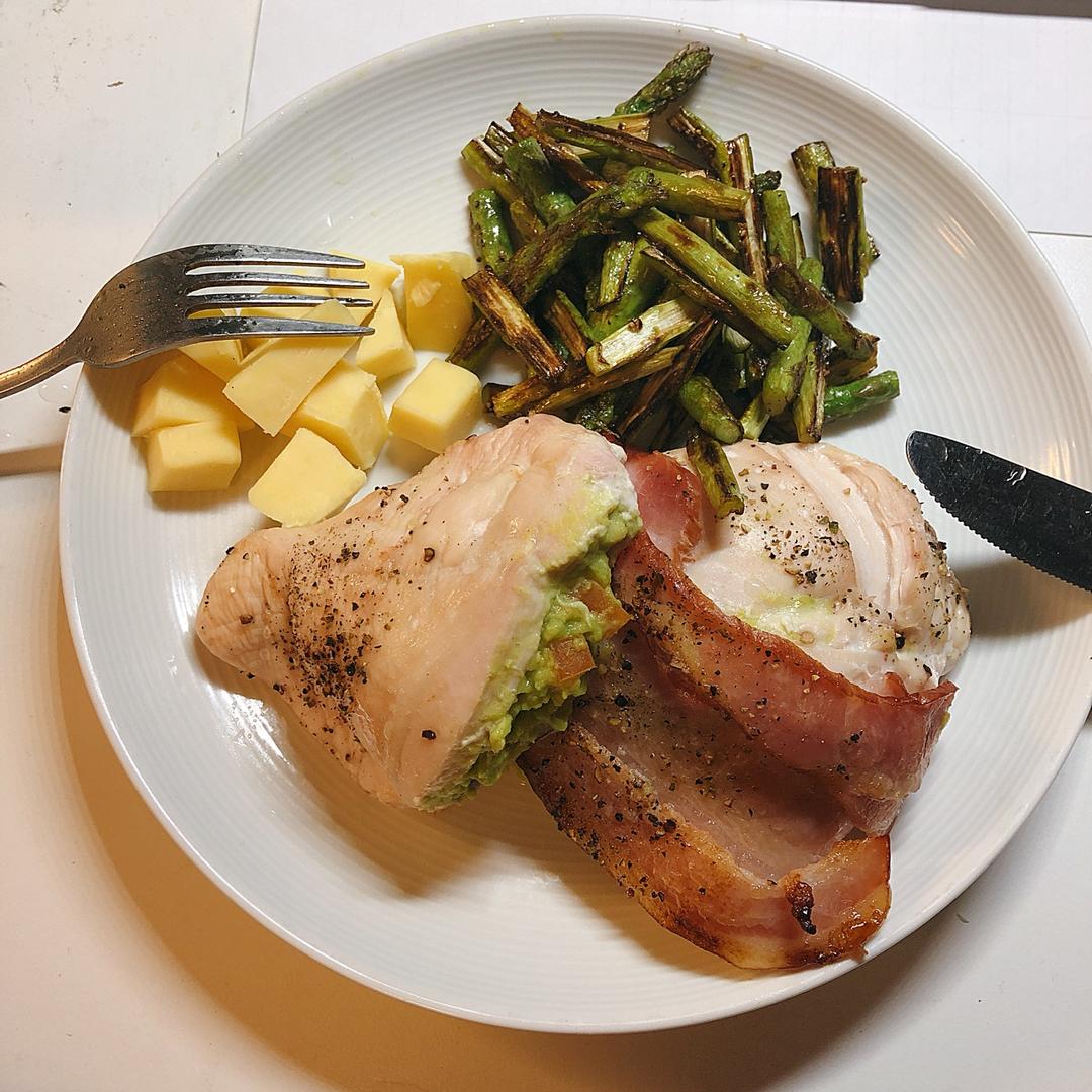 鸡胸肉里面填上guacamole(牛油果+西红柿+洋葱+lime juice)之后包上培根进烤箱 180度15分钟 #I...