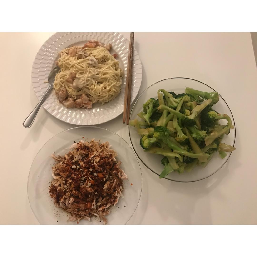 昨天晚饭 蒜蓉西兰花 麻辣鸡丝和白酱虾仁意面
