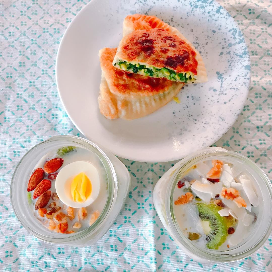 上周早餐 overnight oatmeal 三明治 韭菜盒子 pb花生酱拌饺子 奇异果香蕉smoothie #早餐•2...