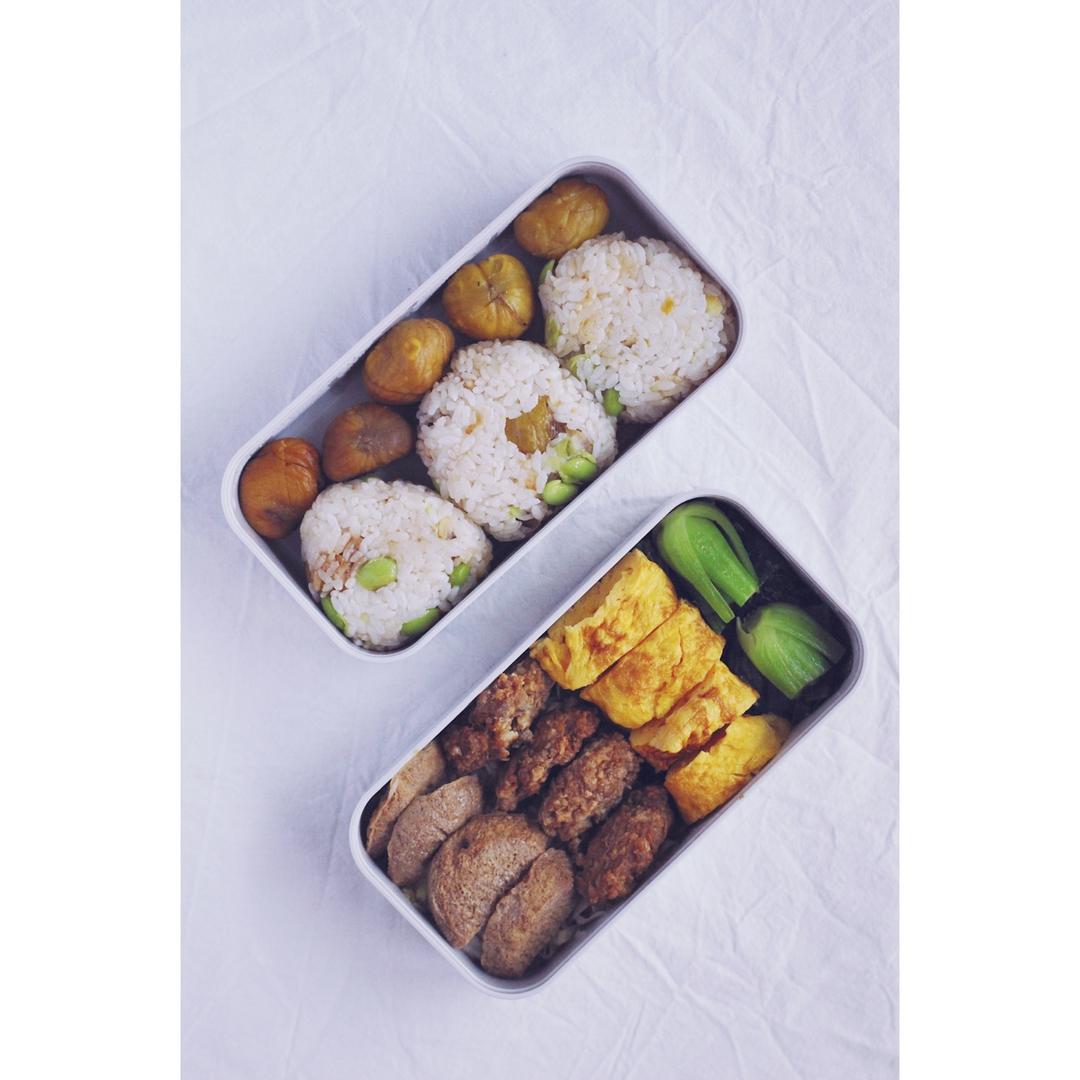 板栗毛豆饭团+卤素鸡/肉饼+厚蛋烧+清炒青菜。练习圆锅做厚蛋烧的技能...