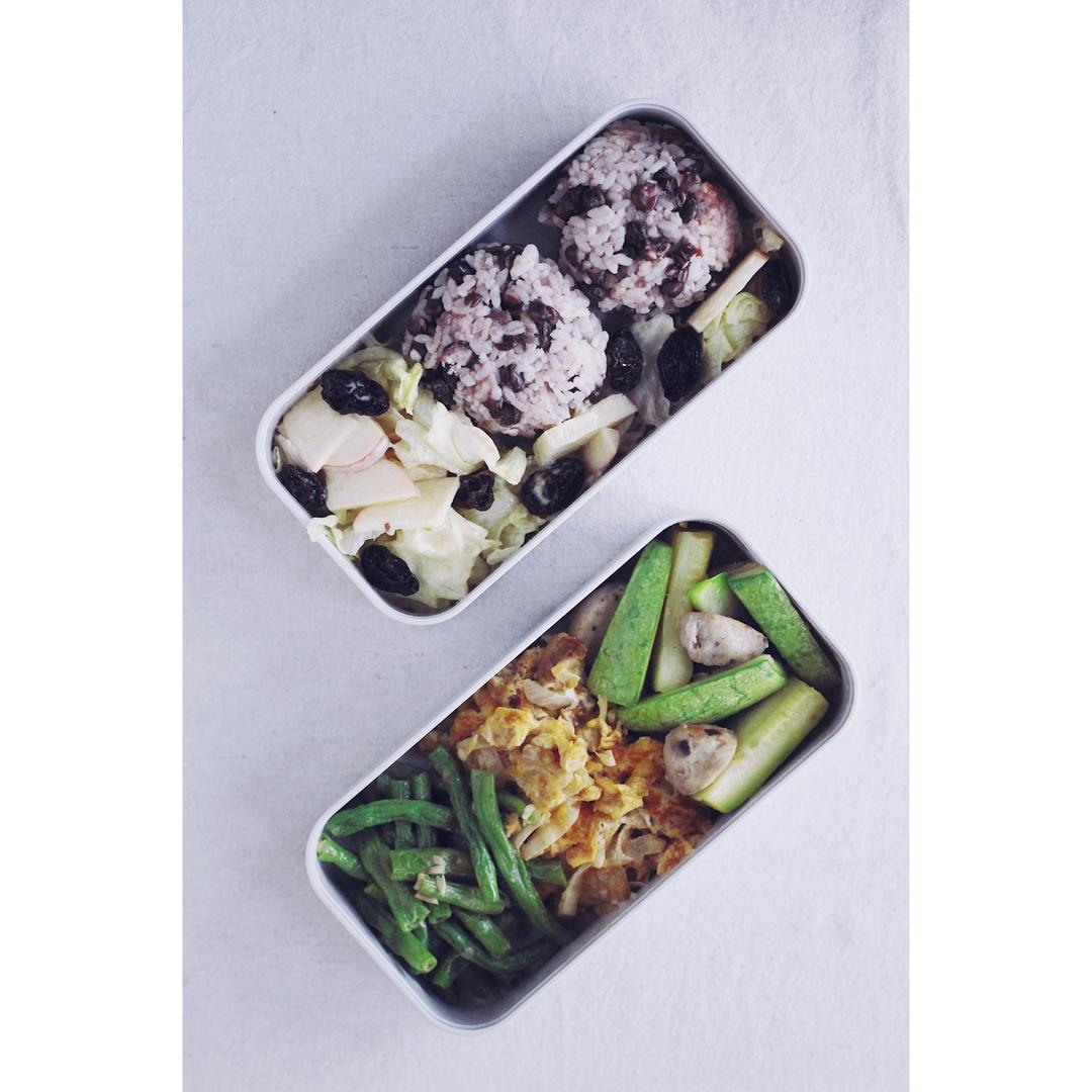红豆饭团+生菜苹果沙拉+生菜煎蛋饼+清炒四季豆+贡丸炒西葫芦