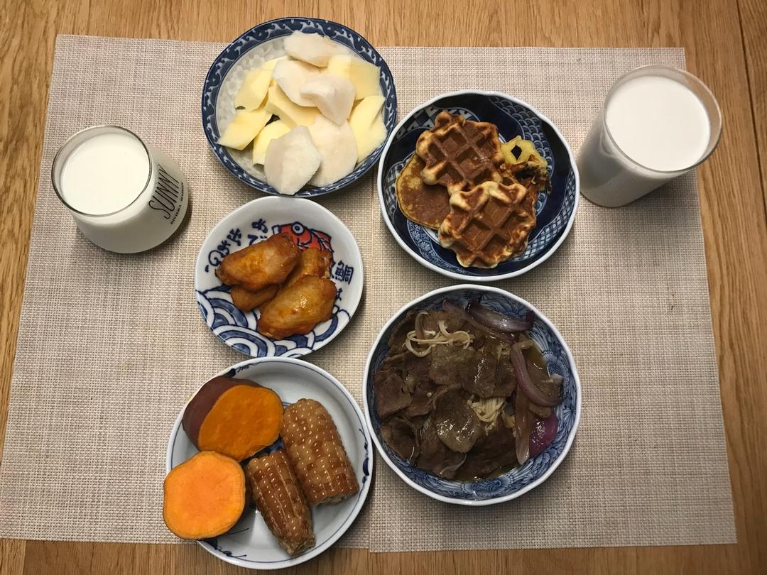 豆沙松饼,牛肉金针菇,烤鸡翅,玉米地瓜,梨和苹果,酸奶,豆奶