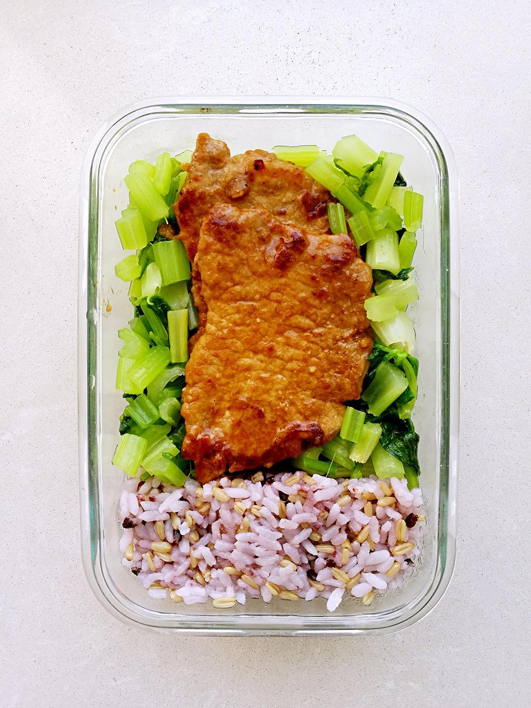 今日便当,蒜香猪扒,清炒芹菜,燕麦黑米饭🍱