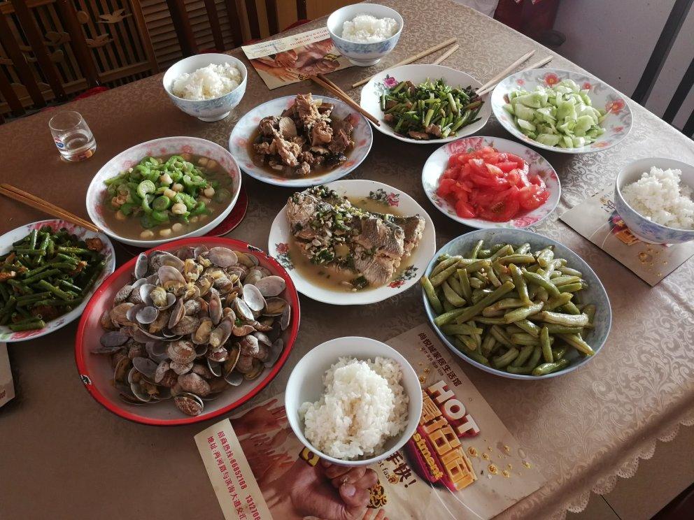 香菇炖鸡,红烧鱼,糖拌西红柿🍅 ,拍黄瓜,丝瓜炒扇贝,豆角炒...