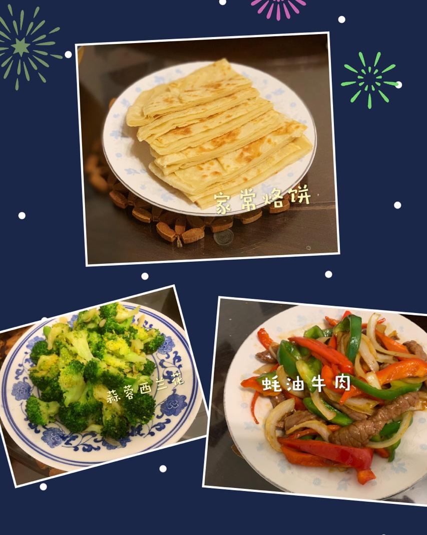 蚝油牛肉、蒜蓉西兰花,家常烙饼。