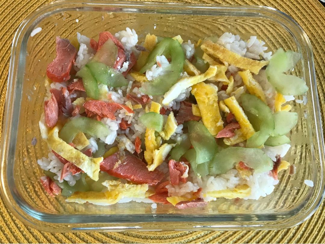 晚上烤三文鱼的时候留了一片鱼给大王做便当。米饭拌了寿司醋,加上三文鱼黄瓜和鸡蛋。鸡蛋用麻油煎的很香。灵感...