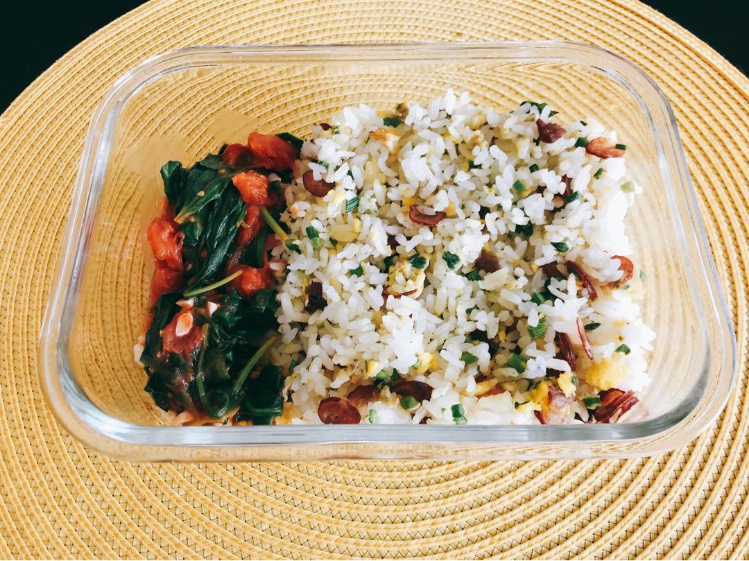 芦笋香肠蛋炒饭+番茄炒菠菜。炒饭的时候先爆了点碎洋葱,好香的