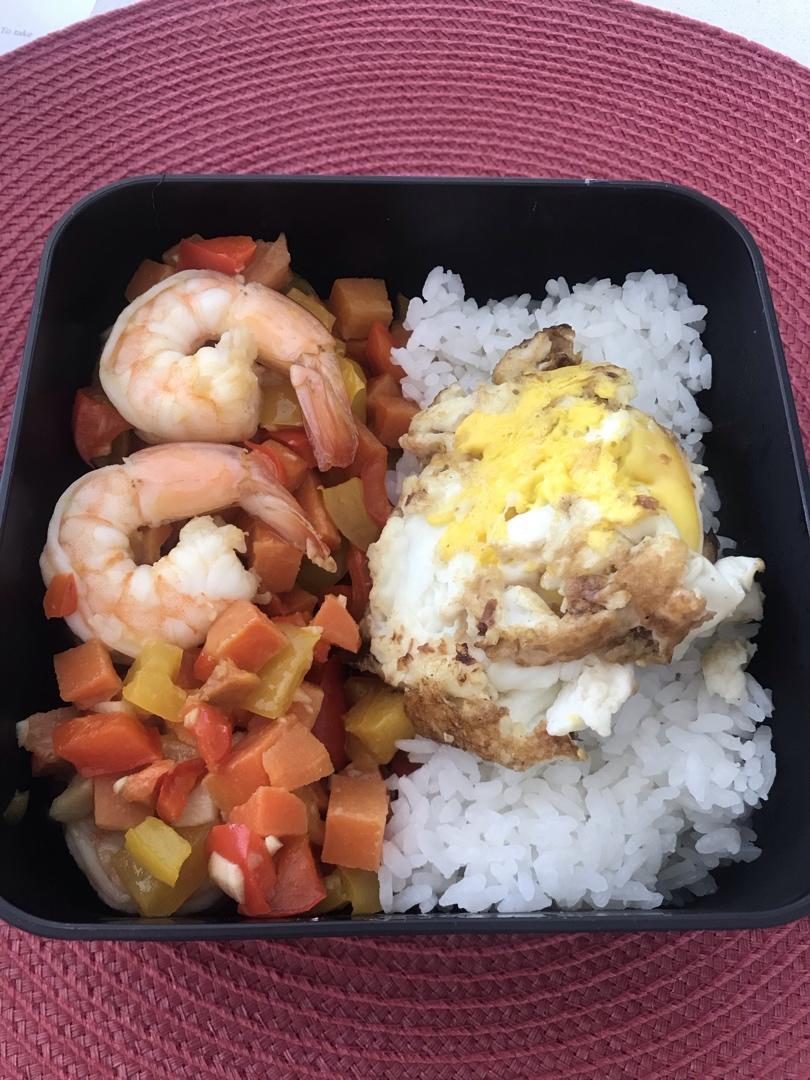 买炸鸡翅送的胡萝卜条吃不完,和彩椒一起切碎炒个虾仁,还有一颗荷包蛋
