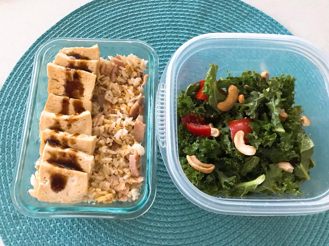 培根蛋炒饭,香煎豆腐,羽衣甘蓝番茄腰果色拉