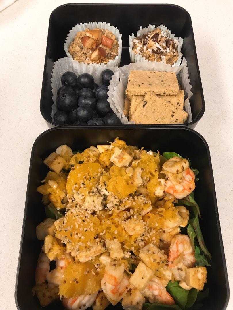 南瓜豆腐虾仁沙拉,撒了松子仁和hemp seed