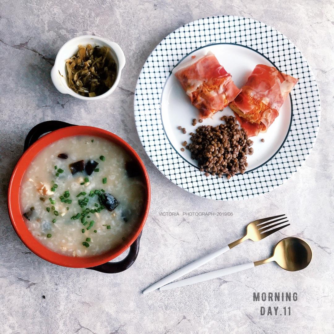 Day.11早餐,中西结合。娃爸的皮蛋鸡肉粥,我的生火腿鸡蛋...