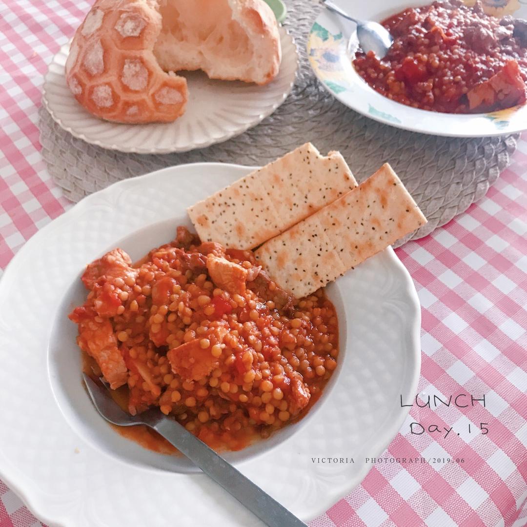 Day.15午餐:牛肉炖小扁豆,主食:面包,奇亚籽饼干。