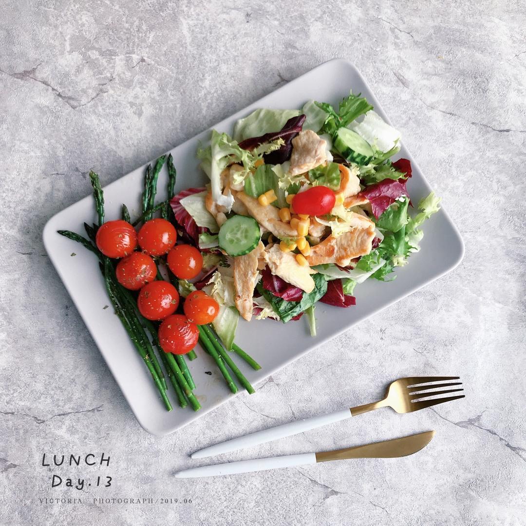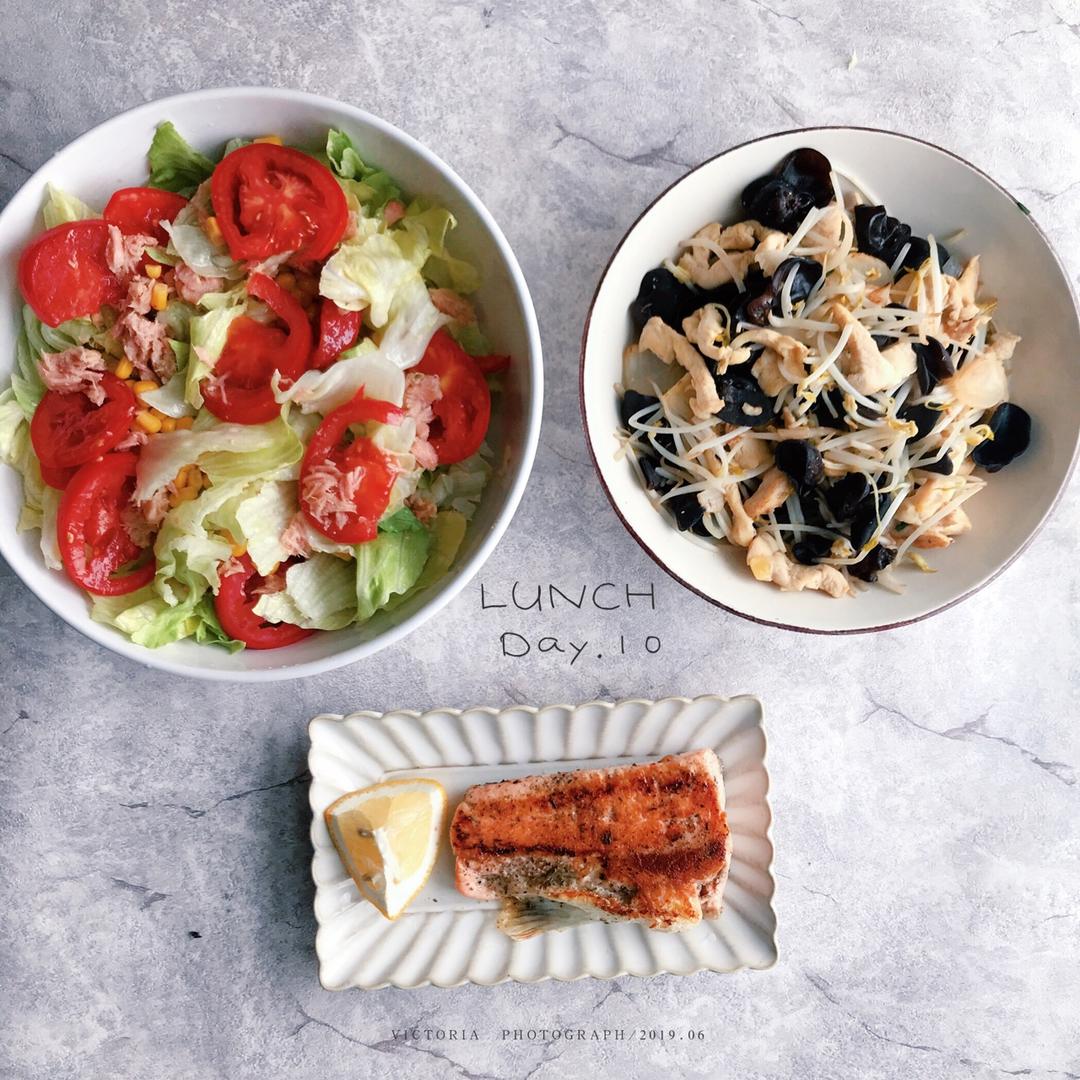 午餐:煎三文鱼,鸡胸肉炒豆芽木耳,沙拉菜。...