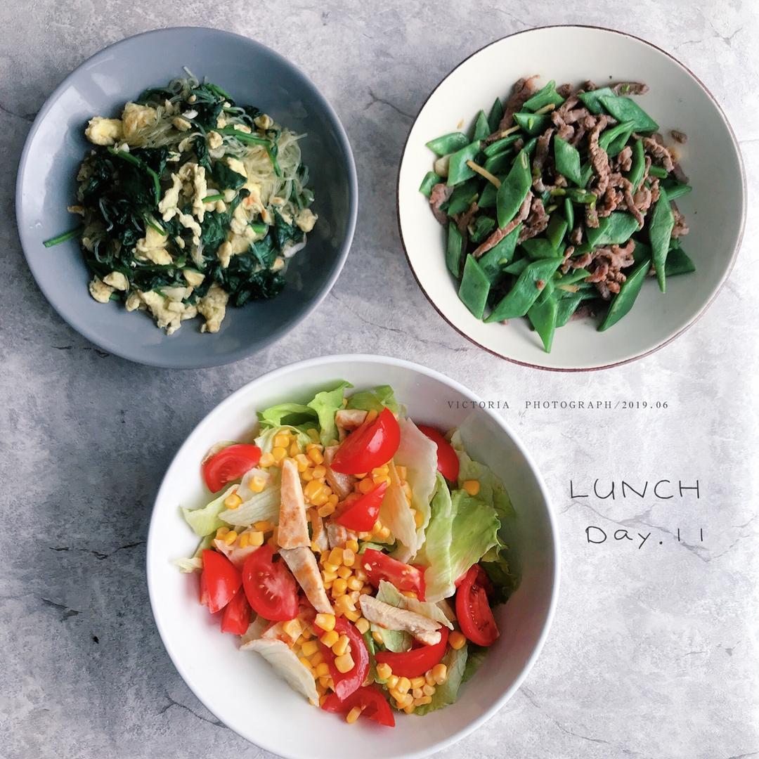 Day 11午餐:菠菜鸡蛋炒粉丝,牛肉炒豆角,沙拉菜,小扁豆...