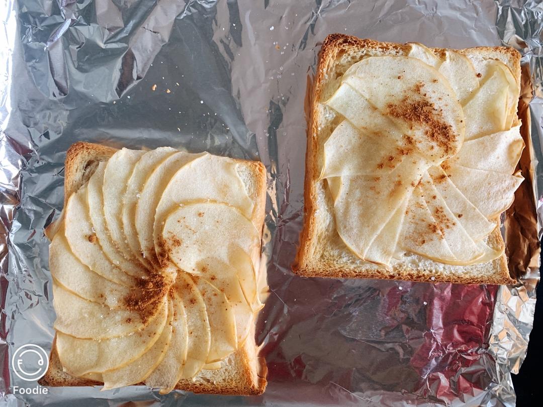如果足够薄,一个苹果铺两片吐司足够。并且都不需要煮糖水就很软很好摆了。