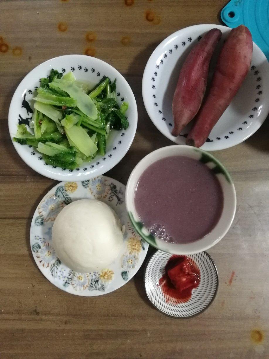 蒸白薯,清炒凤尾,腊八米糊,馒头抹腐乳
