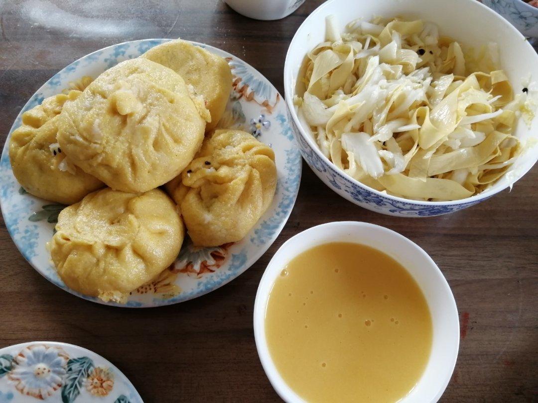 玉米面素包(一半面粉,白菜、木耳、鸡蛋、黑芝麻),南瓜小米糊,拌白菜油豆皮
