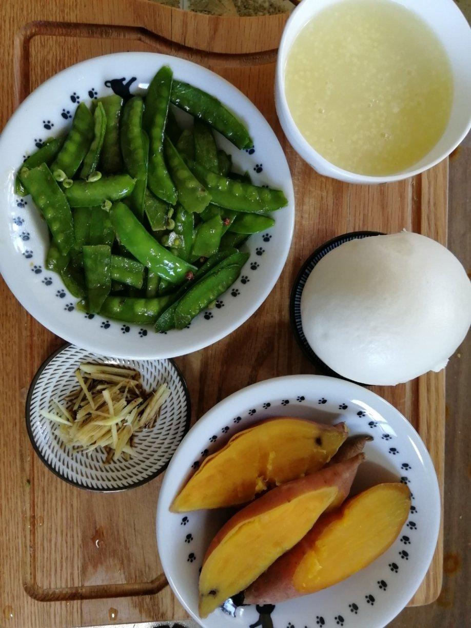早饭:清炒荷兰豆,醋泡姜丝,蒸白薯,小米粥,馒头