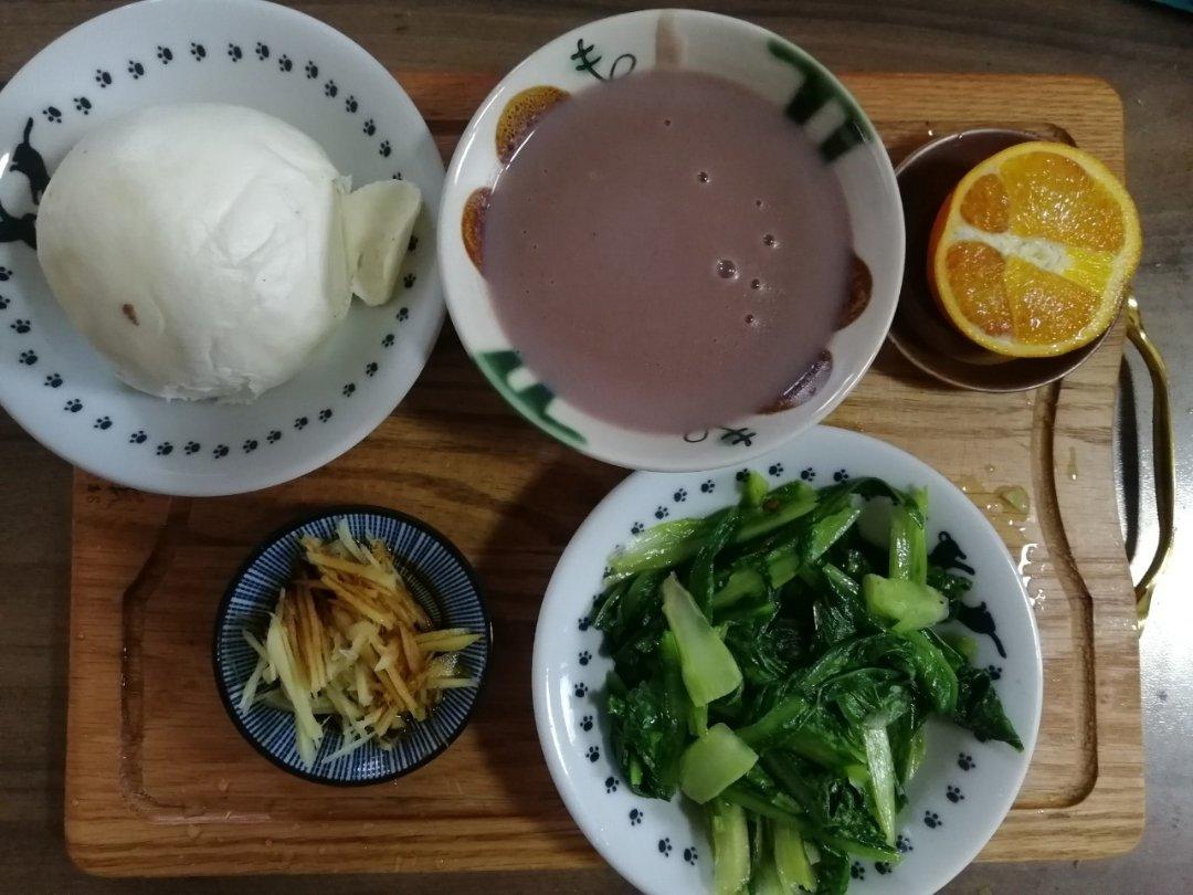 清炒油麦菜,拌姜丝,红豆小米糊,蒸橙子🍊,馒头(半个)