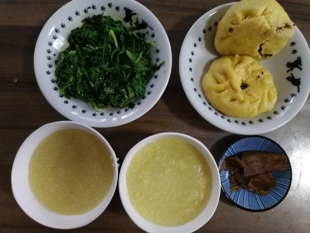 黑芝麻拌茼蒿叶,醋泡姜片,玉米面素包,小米粥