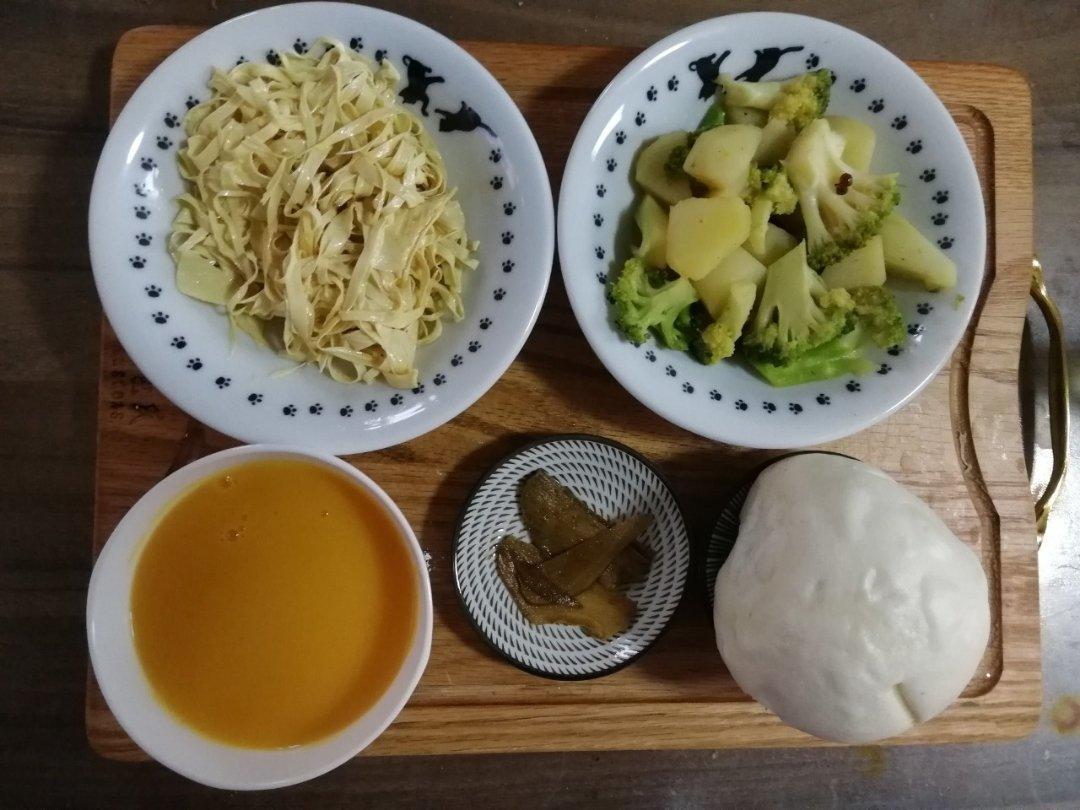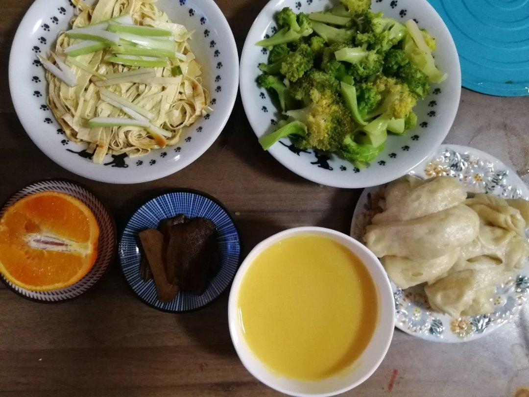清炒西兰花,拌油豆皮,醋泡姜片,蒸橙子,南瓜小米糊,葱油花卷