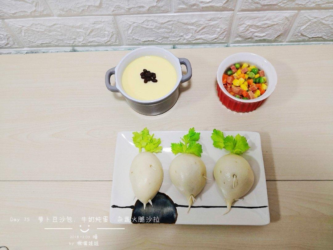 Day 75 亲子萝卜豆沙包配嫩滑的牛奶炖蛋和杂蔬火腿沙拉,美好的一天从早餐开始!#这...