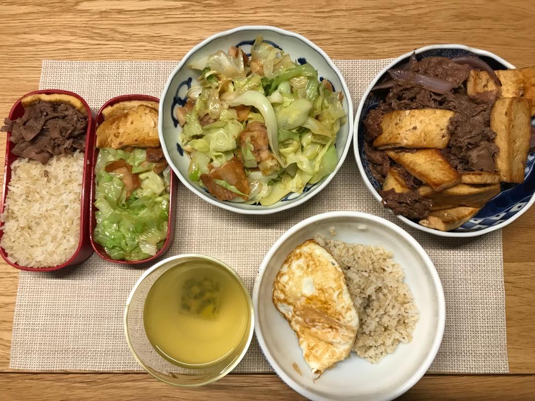 圆白菜炒烧肉,豆腐肥牛,荷包蛋,藜麦饭,百香果蜂蜜水