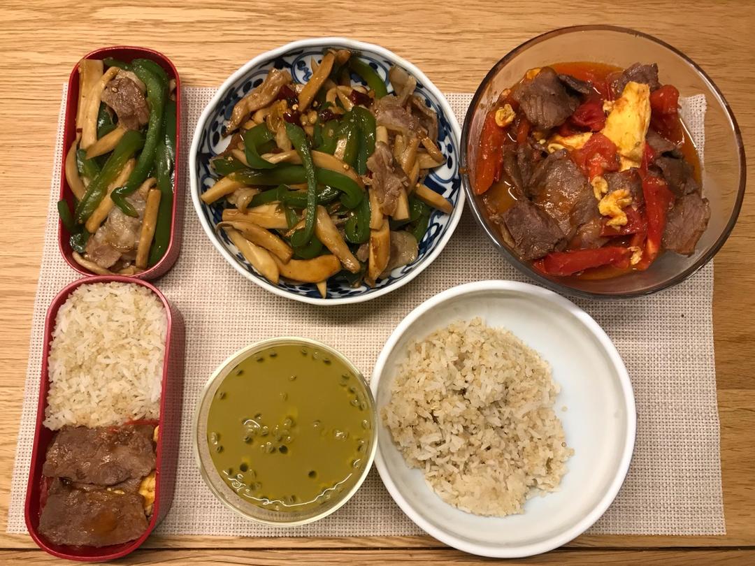 茄牛蛋,青椒杏鲍菇炒肉,藜麦饭,百香果蜂蜜水