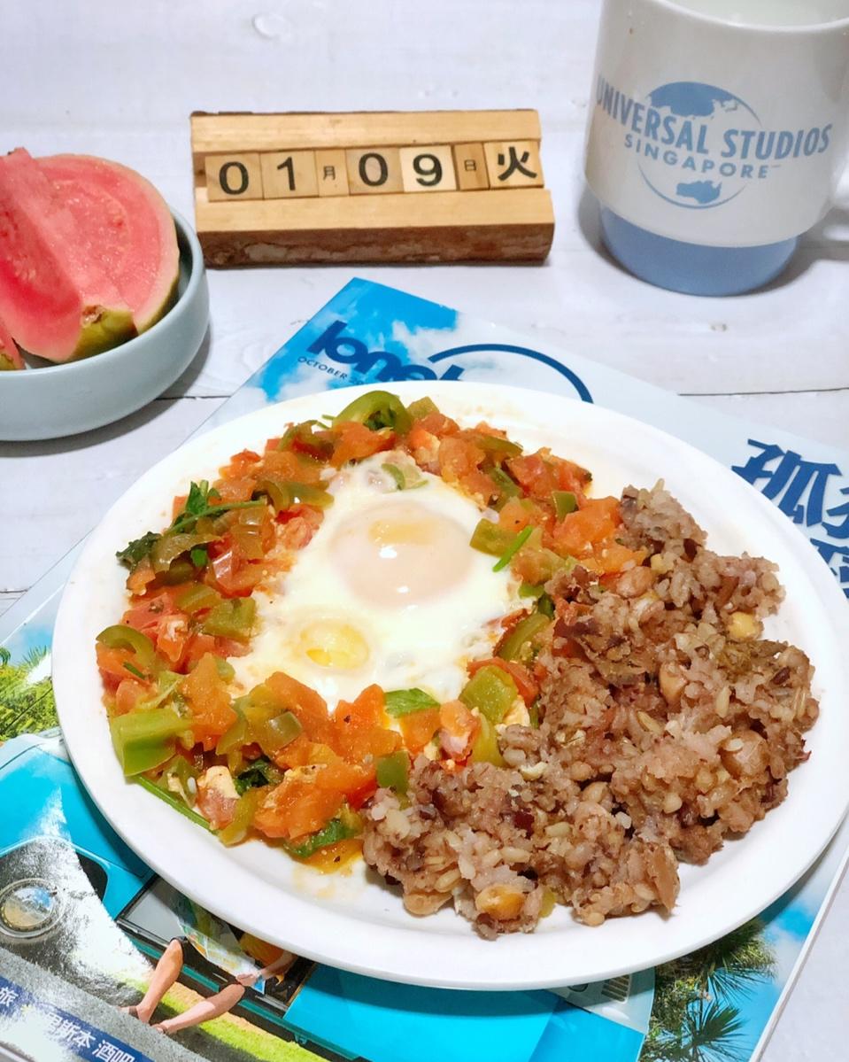 番茄烘蛋,杂粮饭,牛奶,芭乐