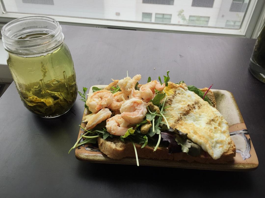 左边用甜虾和spicy brown芥末酱和牛奶鸡蛋吐司中和掉左半边的苦苦的芝麻菜口味;右边是煎蛋沙...