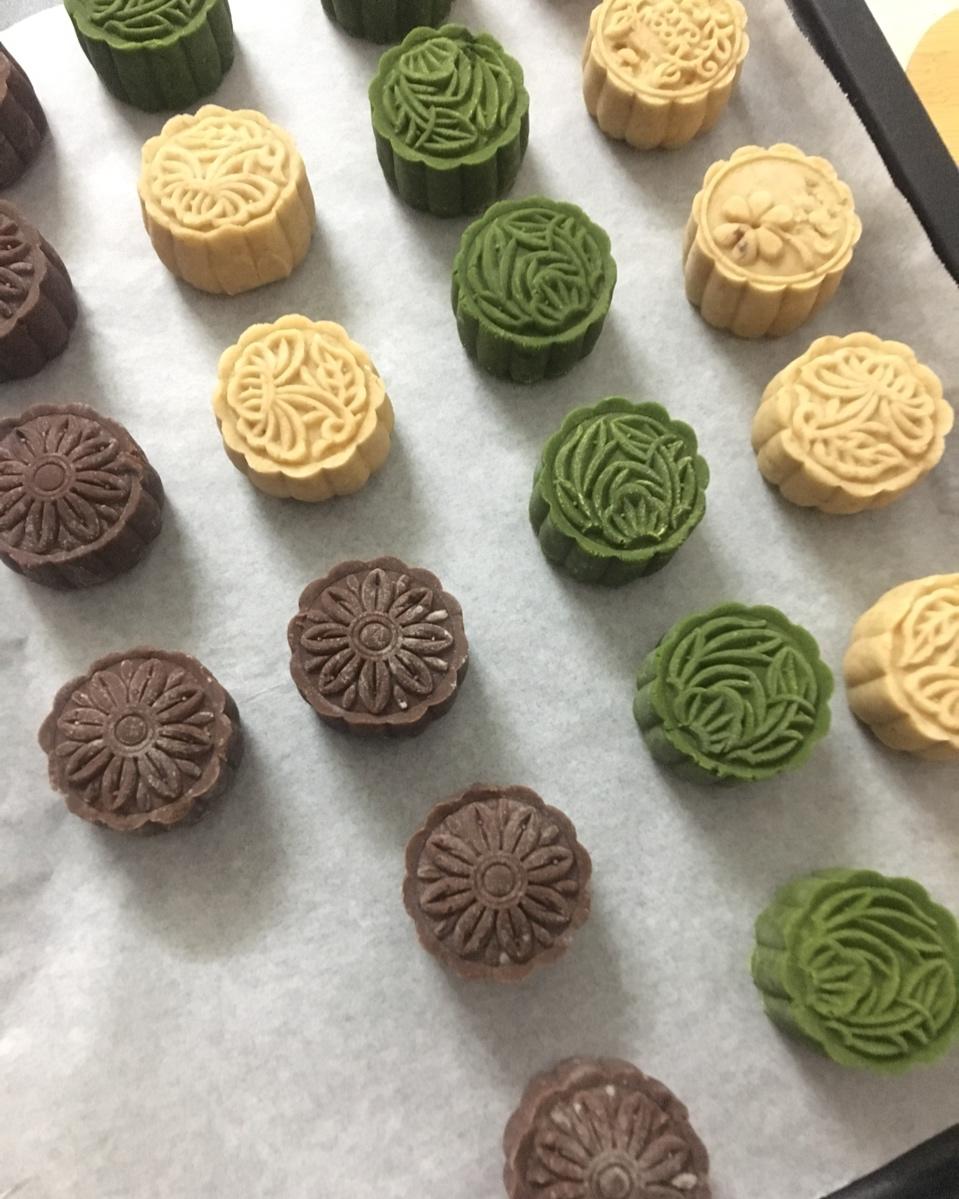 第一次做月饼,里面的麻薯会膨胀,月饼看上去圆鼓鼓的,也有一些开裂~