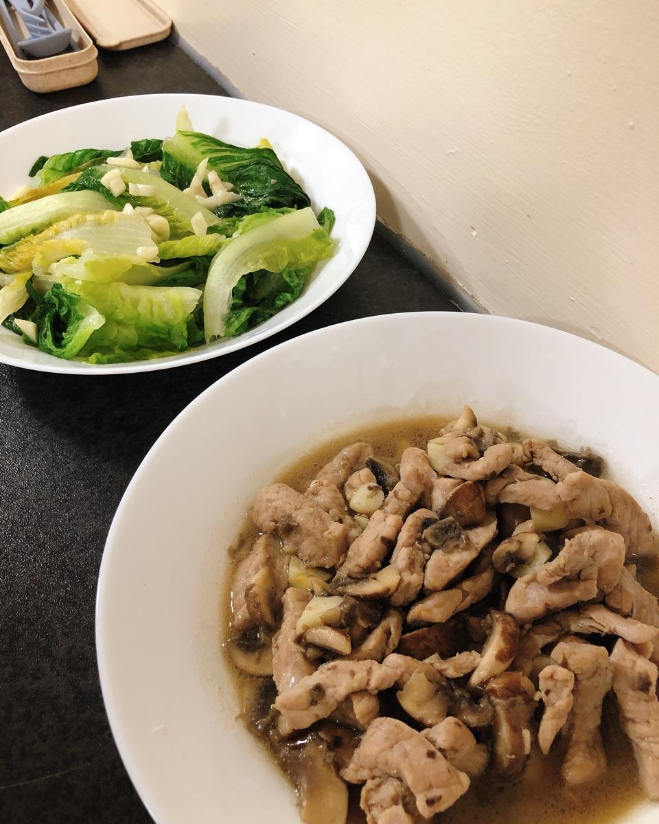 平底锅烘蘑菇 xo酱拌厚百叶 橄榄菜炒卷心菜