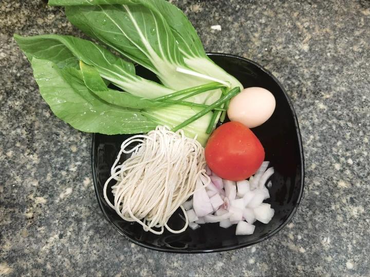 上海青4片+番茄1小个+鸡蛋1小个+碱面82g+葱2段+洋葱粒若干+醋酱油蚝油糖一丢丢 (面...