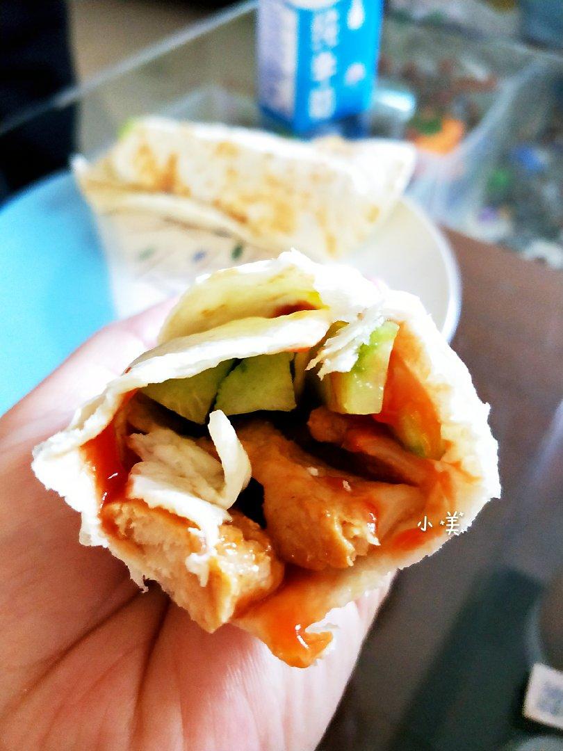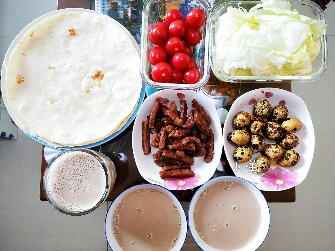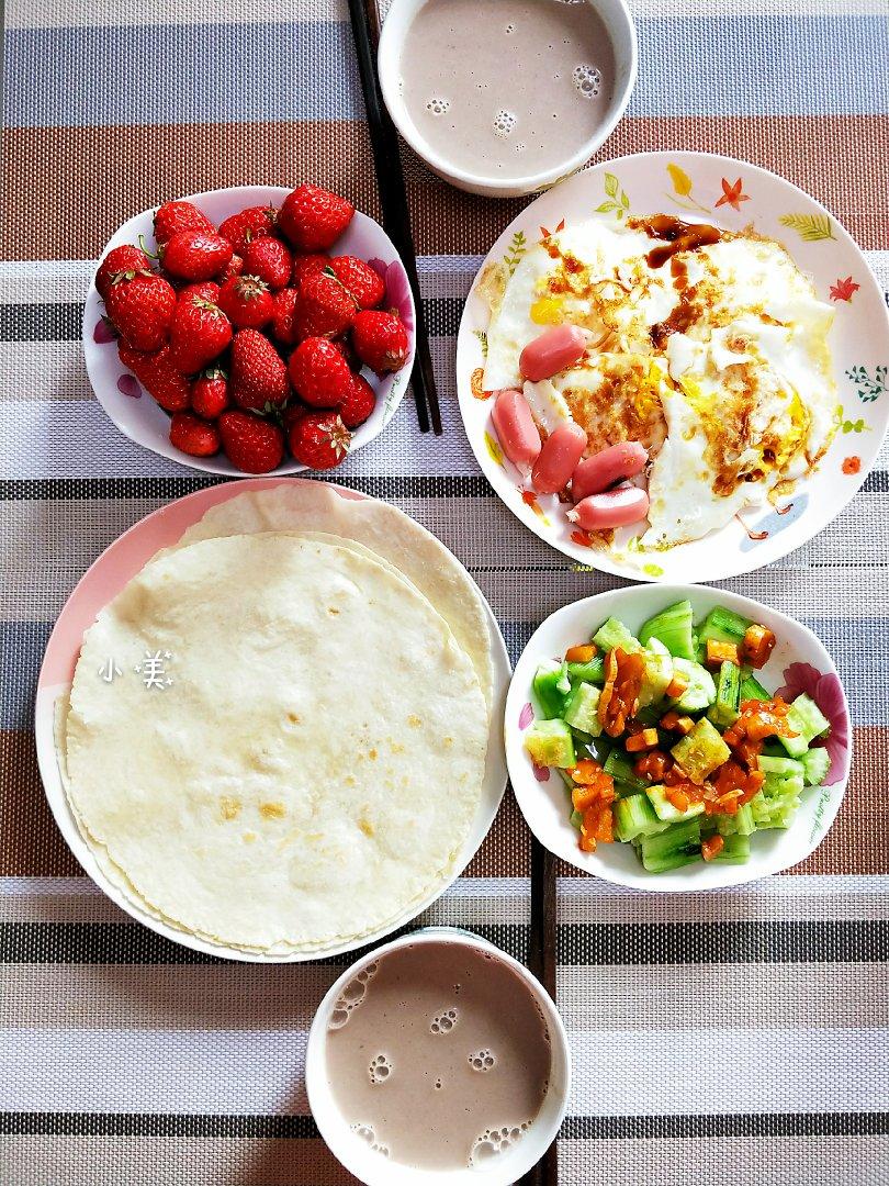 一人一卷,鸡蛋鸡肉黄瓜小咸菜……配上牛奶,完美😊