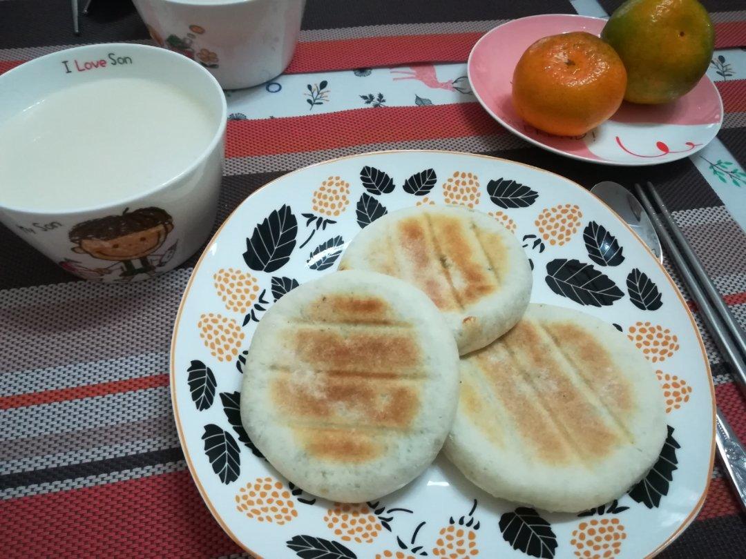 韭菜肉馅儿饼、豆浆、橘子~