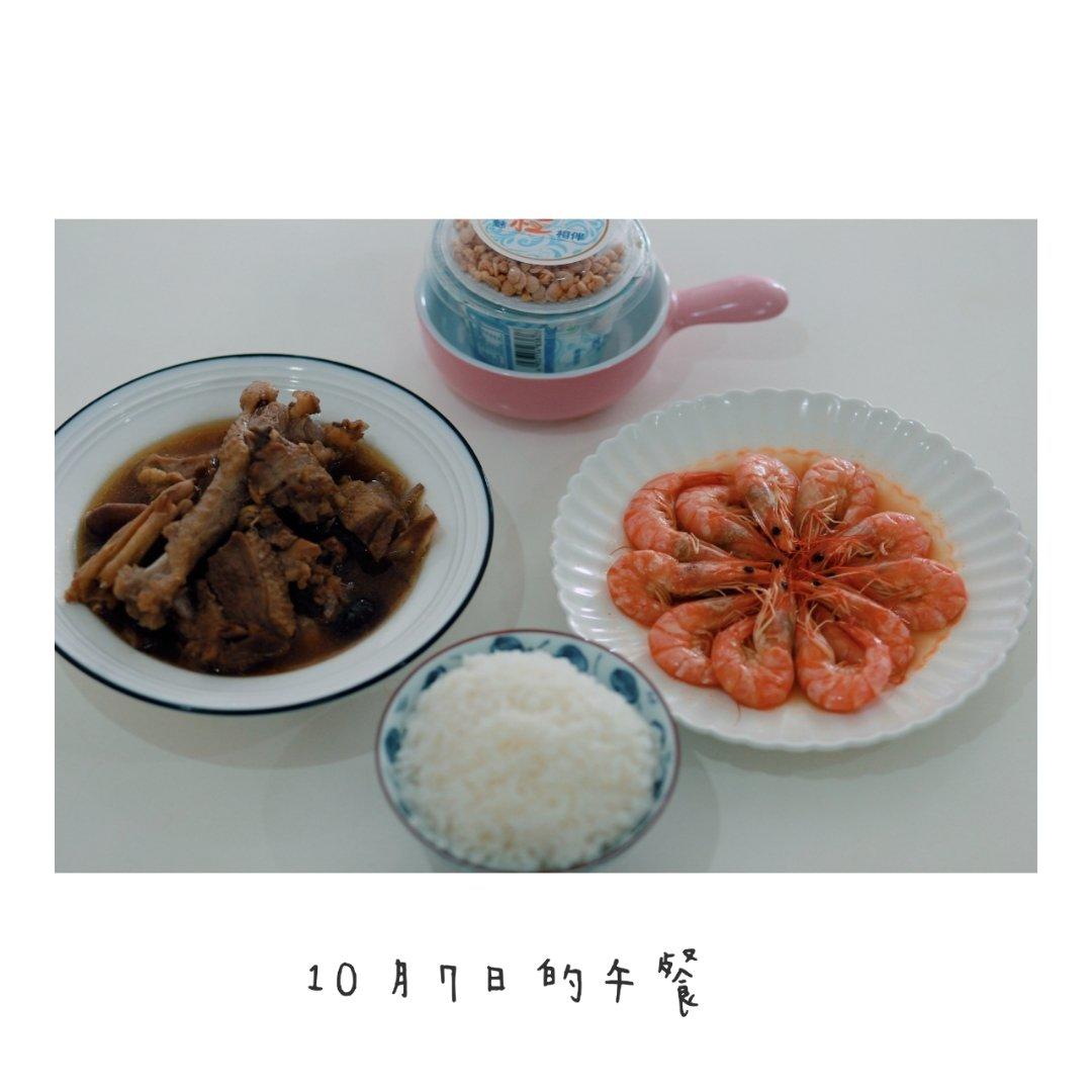 一人食。今天的菜是公公婆婆特意送过来的。有四样哦,感觉吃不完,留了两盘放在晚上吃。虾虾很...