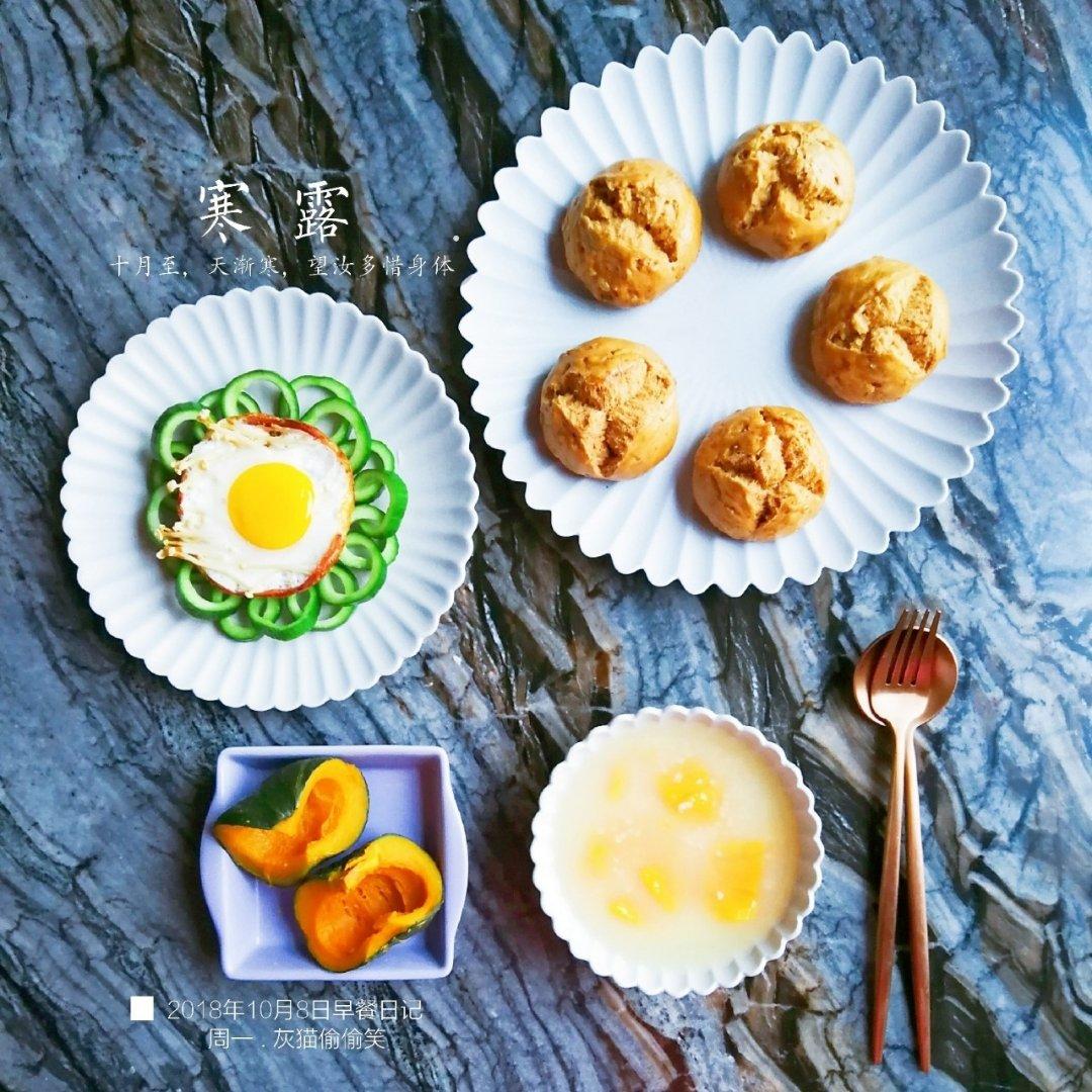 2018年10月8日周一早餐:红糖麦仁开花馒头,红薯小米粥,金针菇培根煎蛋,黄瓜环环相扣,蒸贝贝南瓜。今天是寒露,天气渐...