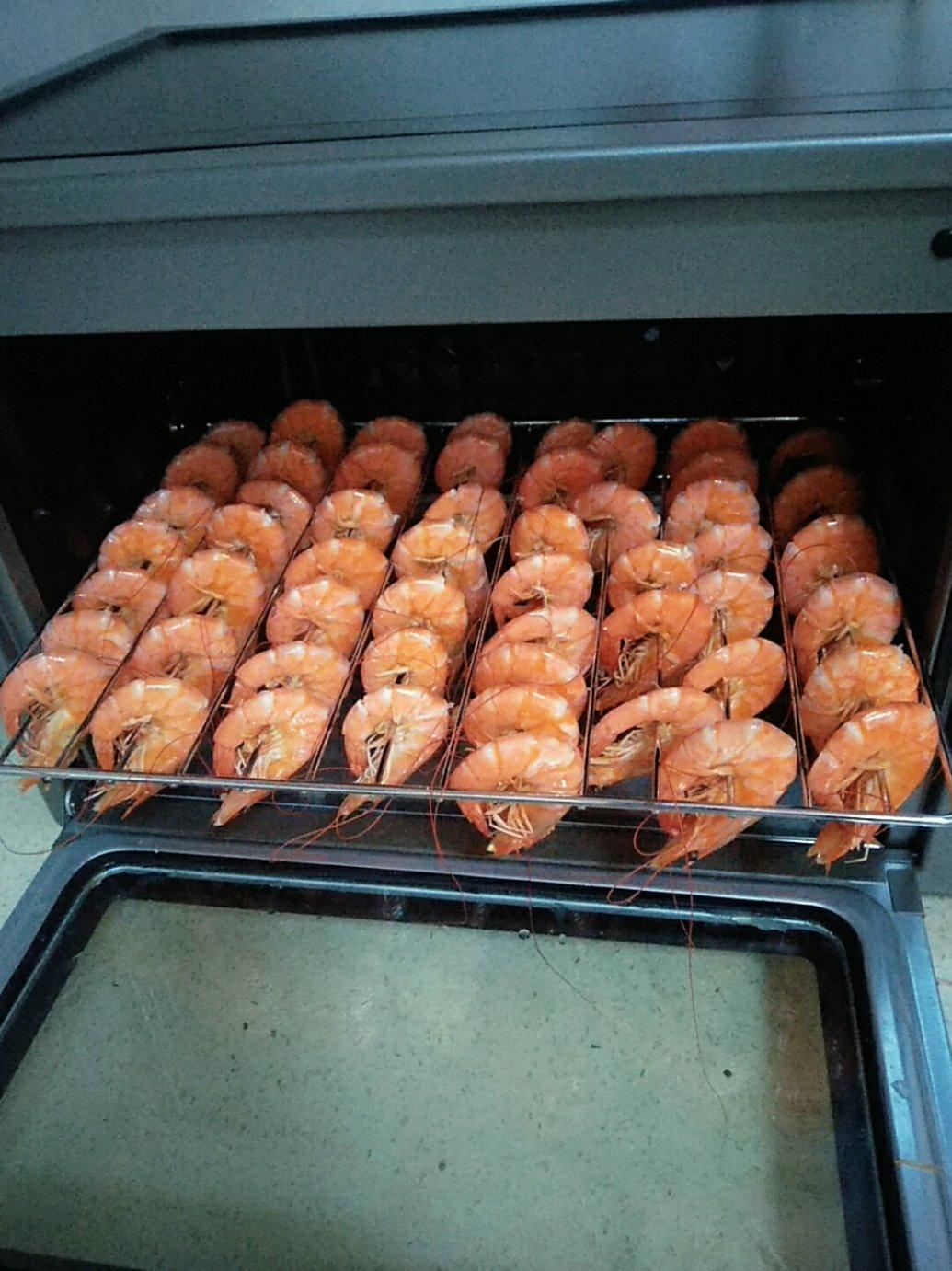 新鲜大虾挑虾线,加葱姜料酒盐煮熟后,烤箱180度烤35分钟。成功!