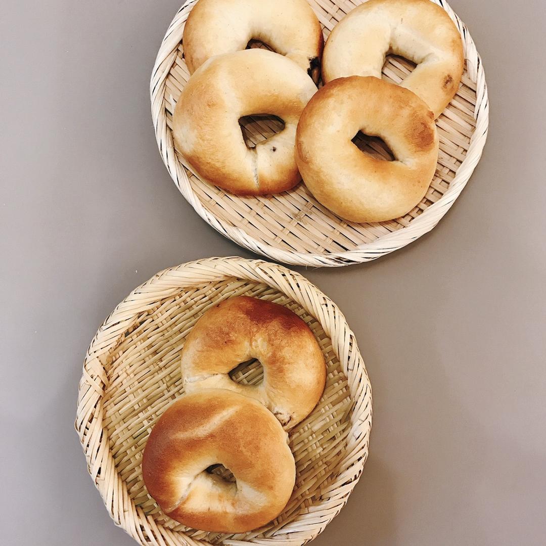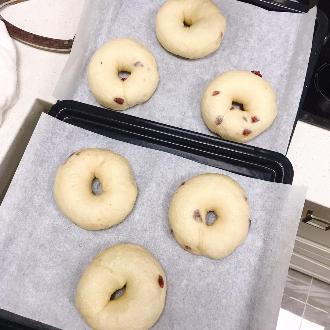 第一次做贝果🥯,成品摸起来很弹弹。高粉不够就加了点全麦粉和低粉,冰箱里有浸泡了朗姆酒的蔓越莓,刚好放进贝果了,烫面团的时...
