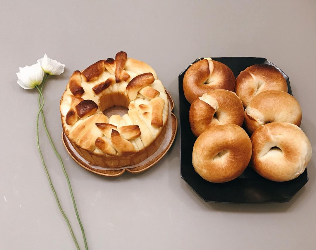 今天的香浓炼乳面包和豆沙陷贝果:炼乳包比上一次更高,应该会更松软。豆沙贝果🥯感觉糖水的糖这次➕多了,上色比上一次深,有馅...