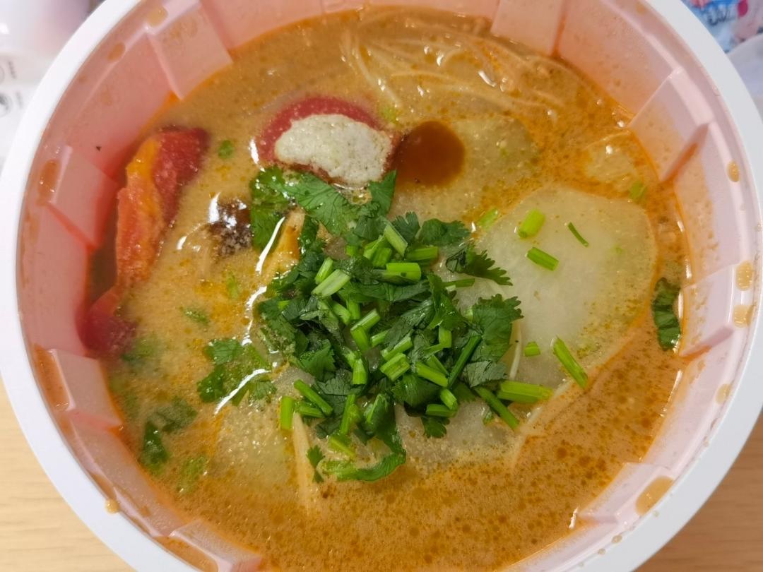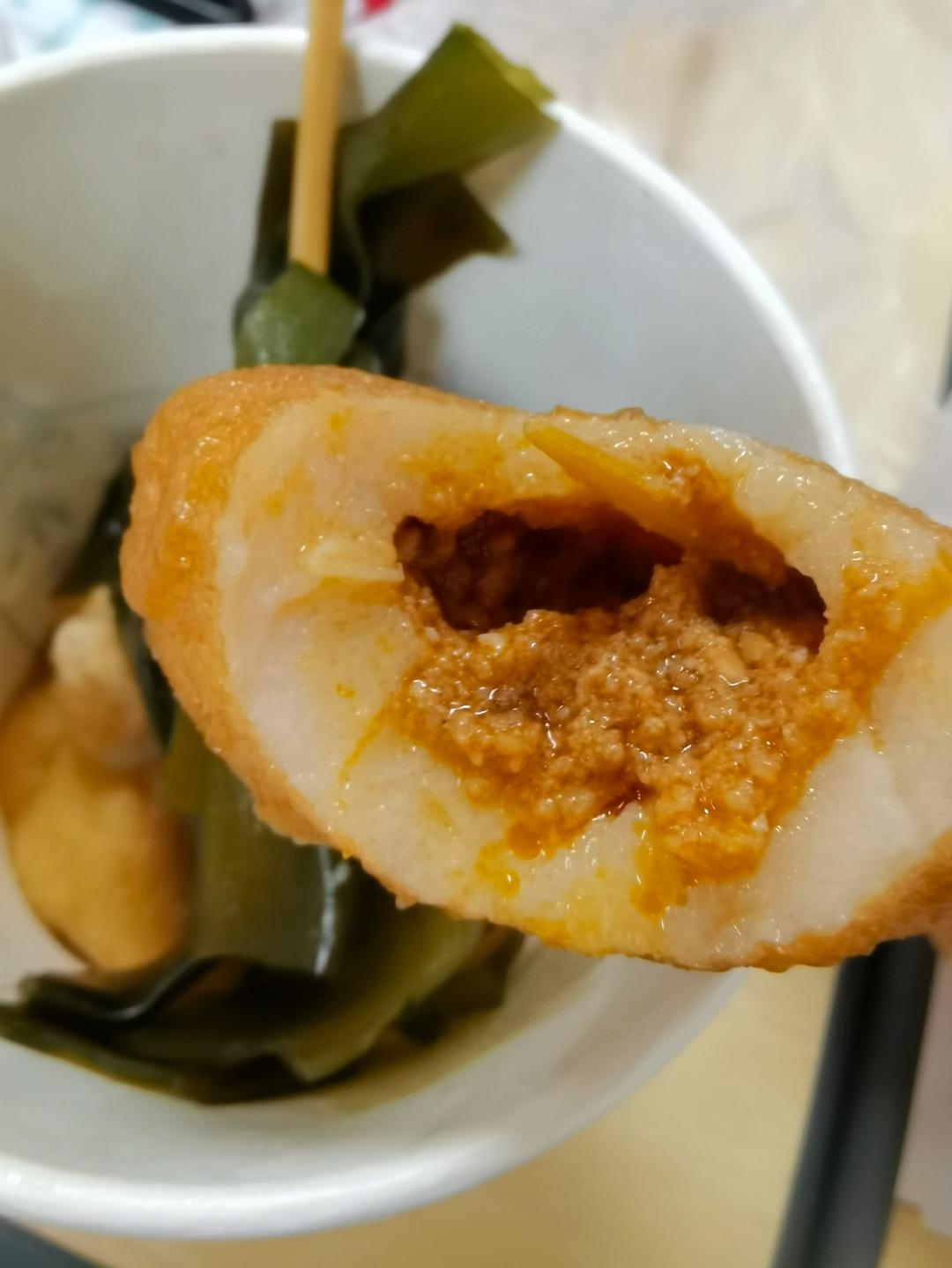 圆鼓鼓的东西看着好可爱。便利店小姐姐说里面是“麻婆豆腐剁碎,辣的很好吃。超级安利~” 被她可爱到了,直接要了两个。