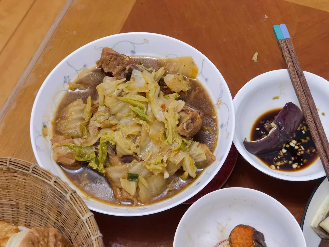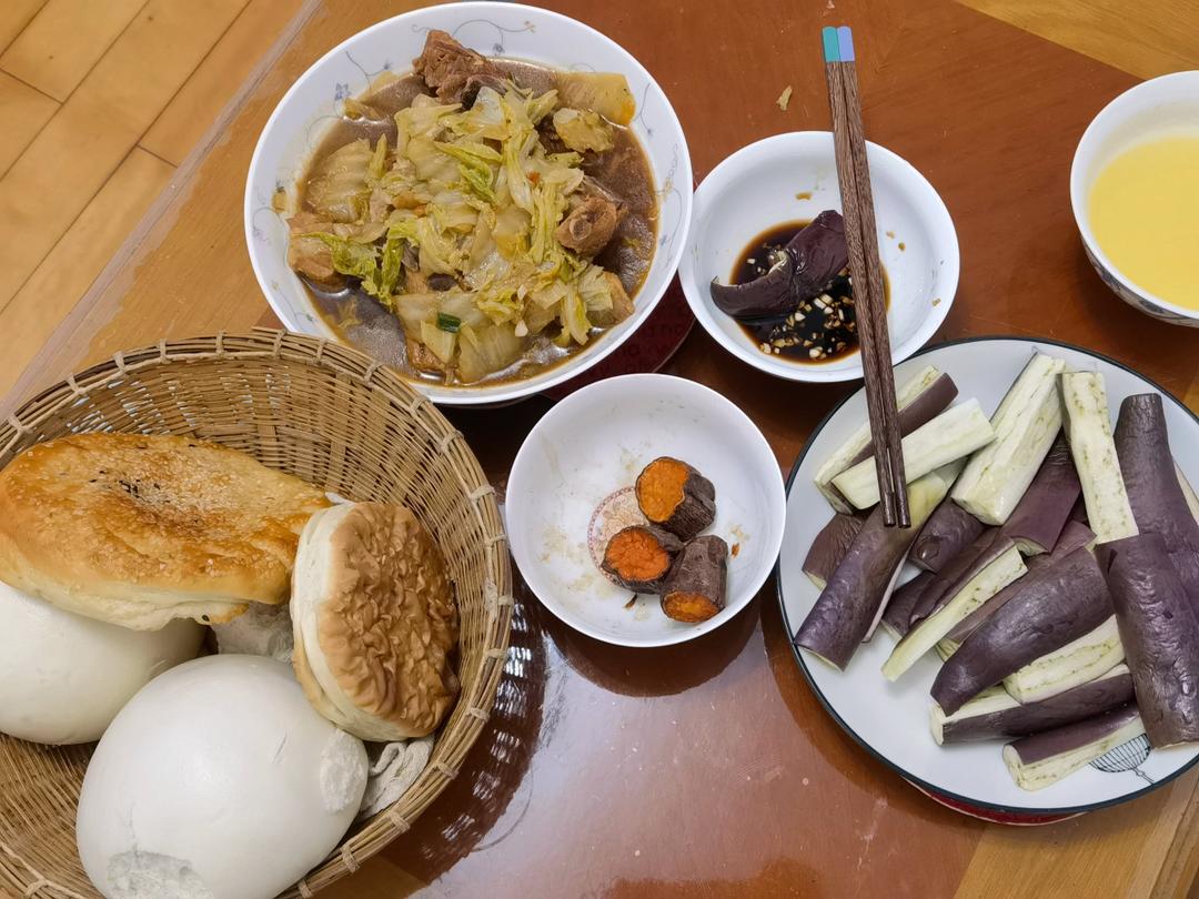 白菜炖排骨,蒸茄子,馒头,火烧,烤地瓜🍠。
