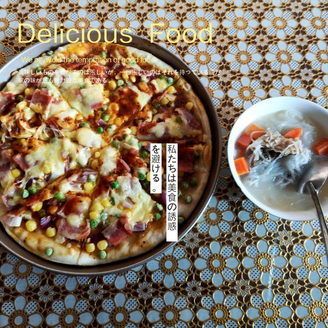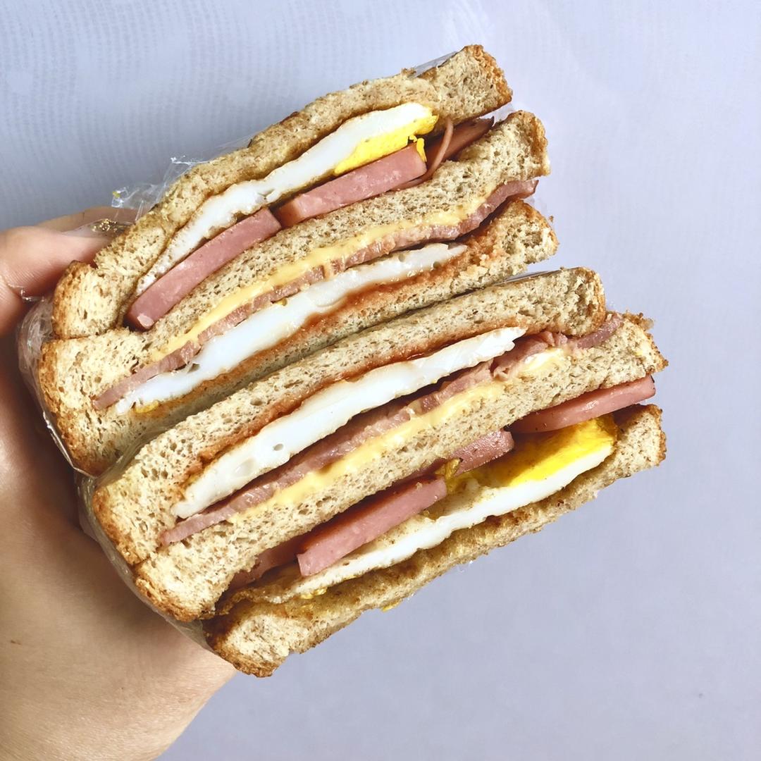 放了培根🥓火腿、鸡蛋,芝士片,少许番茄酱,面包🍞用黄油煎一下,柔软香甜