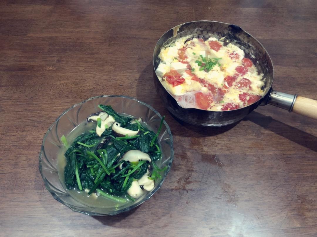 香菇炒菠菜+小番茄豆腐鸡蛋魔芋汤