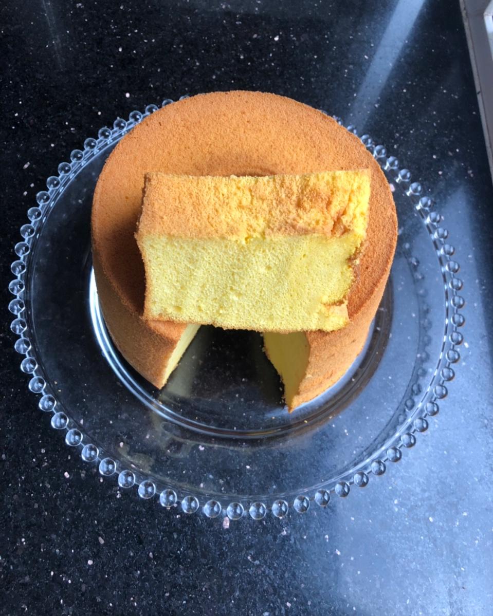 南瓜🎃戚风蛋糕,南瓜用微波炉转了4分钟,过筛捻碎,按食谱8寸又多加了一个蛋,味道偏淡不甜,还可以。