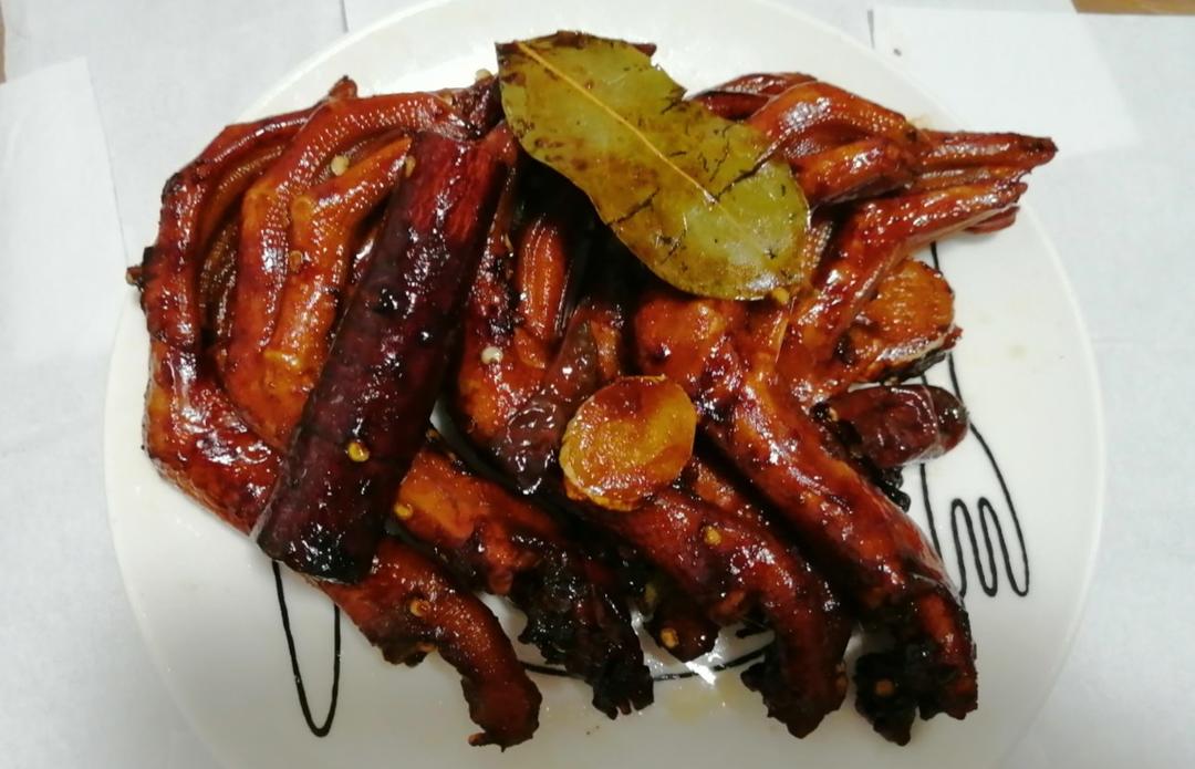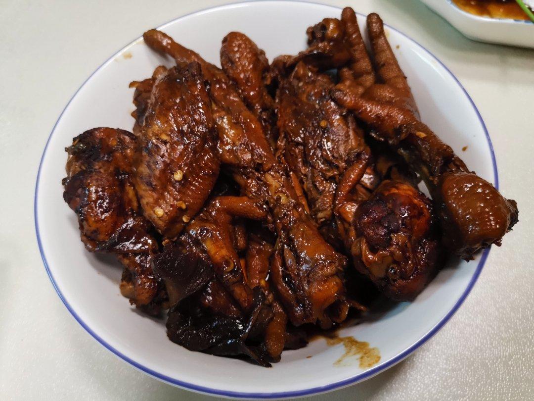 鸡爪和鸡翅,用铸铁锅大约炖了两个小时,还放了蘑菇,土豆和豆腐皮,下次放点海带扣和腐竹,老公说味道特别好,基本入味很深,估...