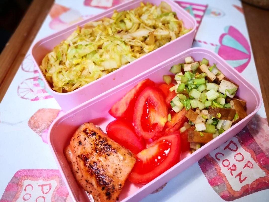 醋溜圆白菜+芹菜拌豆干+香蕉三文鱼配番茄